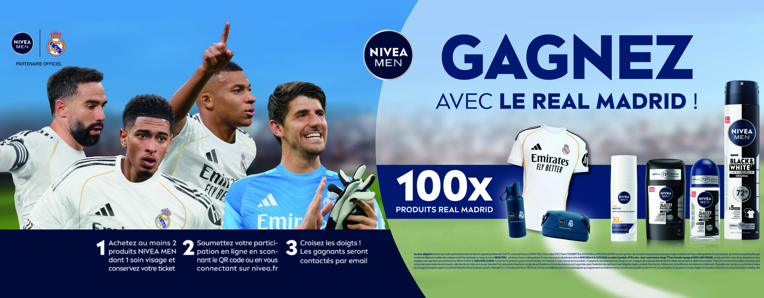 Du 1 janvier au 31 mai 2026, achetez au moins 2 produits NIVEA MEN dont 1 soin Visage homme* pour tenter de gagner un kit cadeau de la célèbre équipe de foot – REAL MADRID !