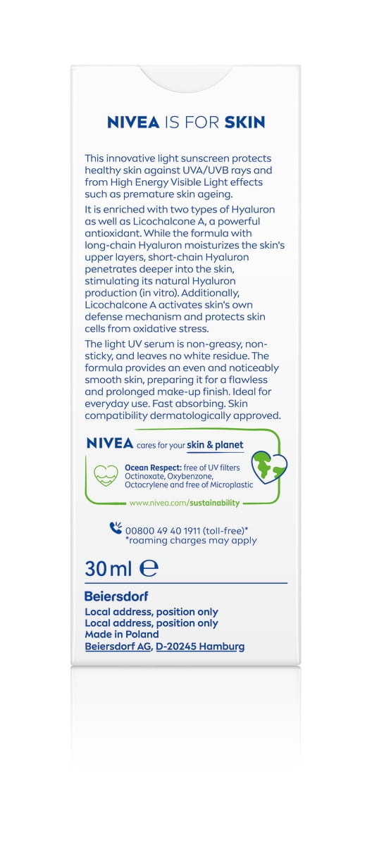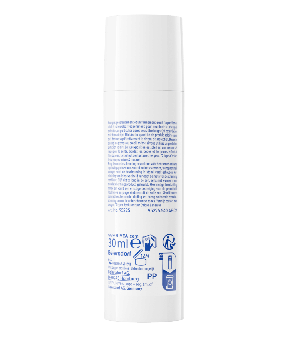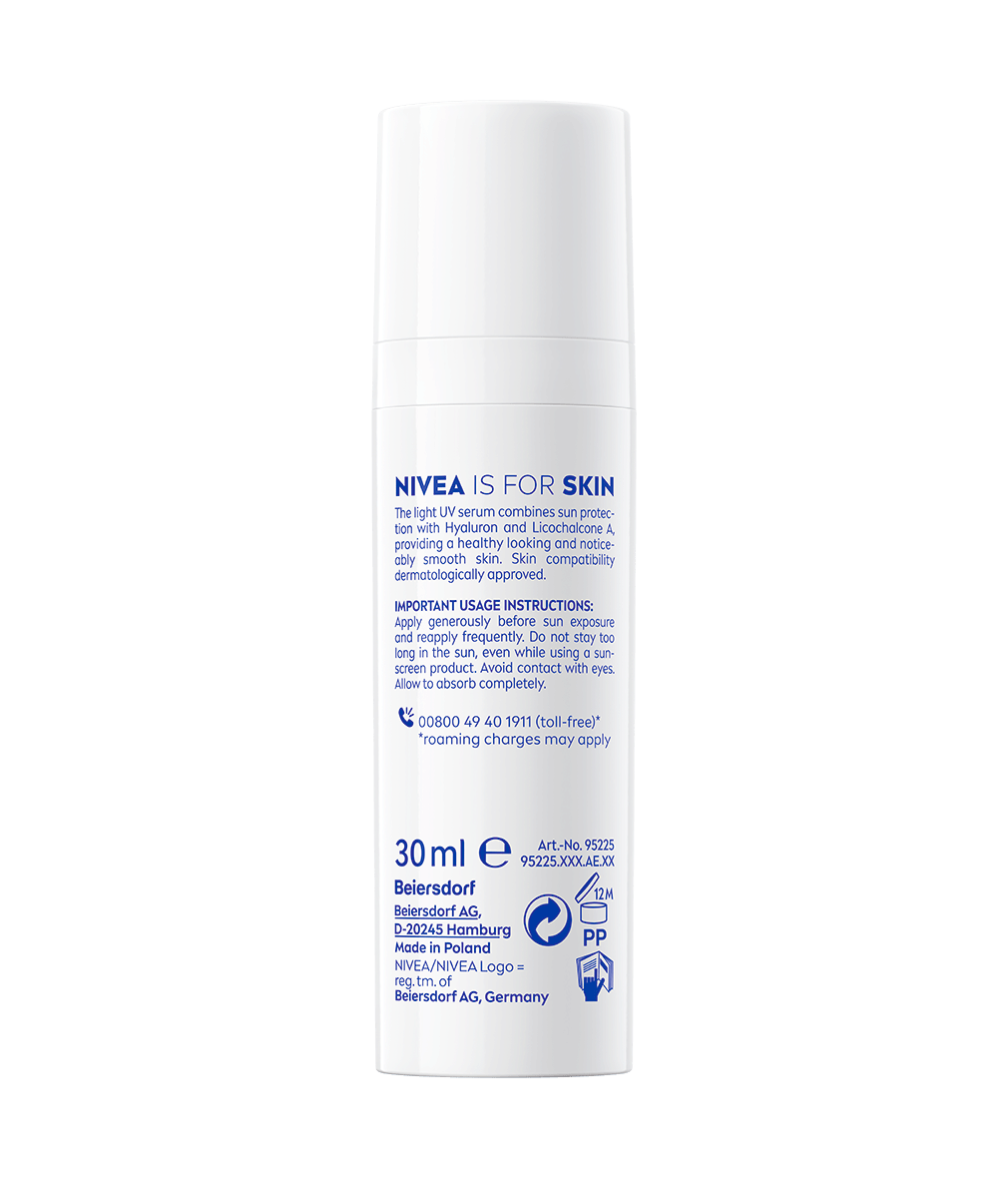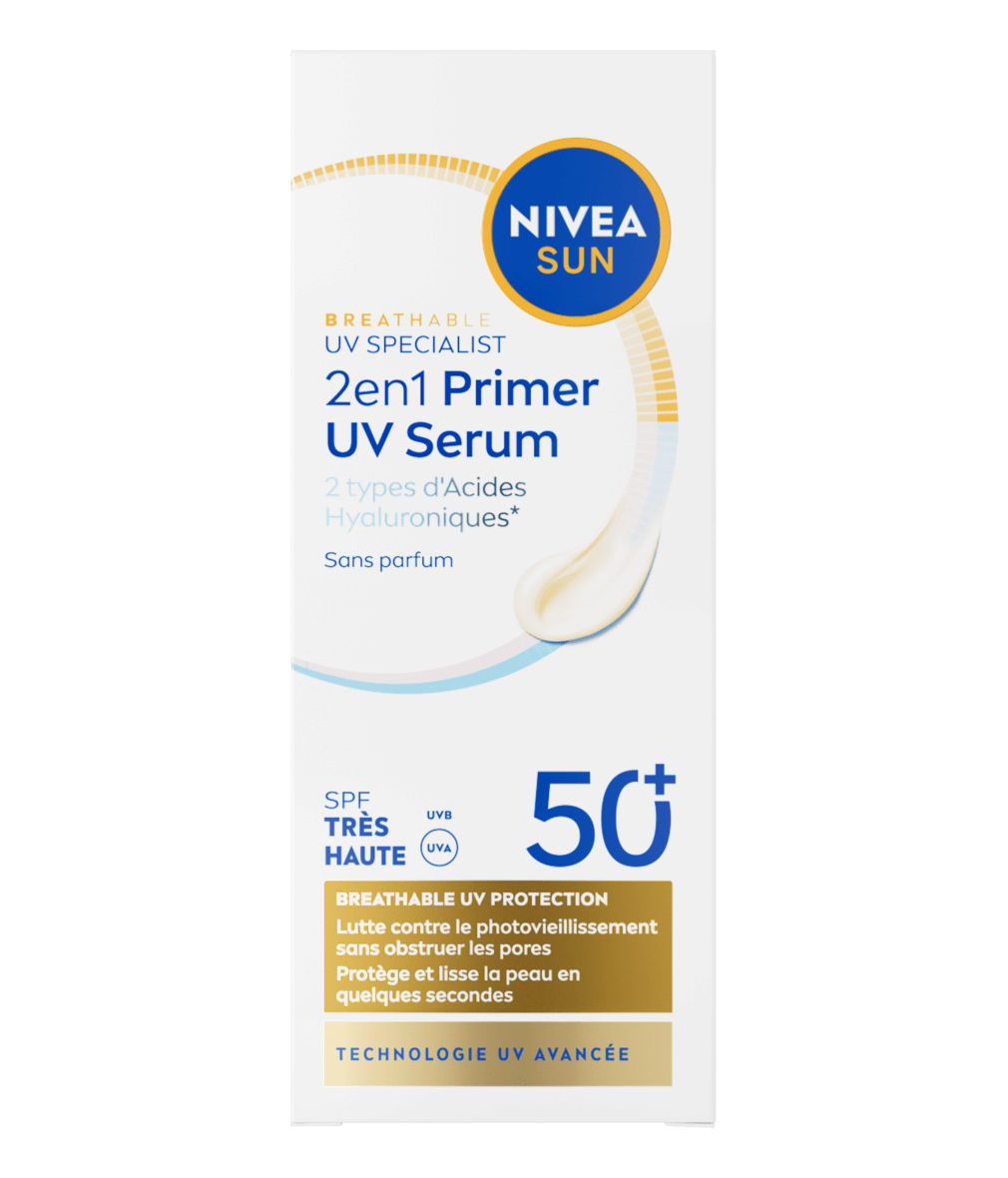 Le soin UV quotidien 2en1 Sérum Primer SPF 50+ NIVEA SUN protège contre les UVA/UVB, lisse la peau et la prépare au maquillage. Sa texture légère et sans parfum est idéale pour un usage quotidien.