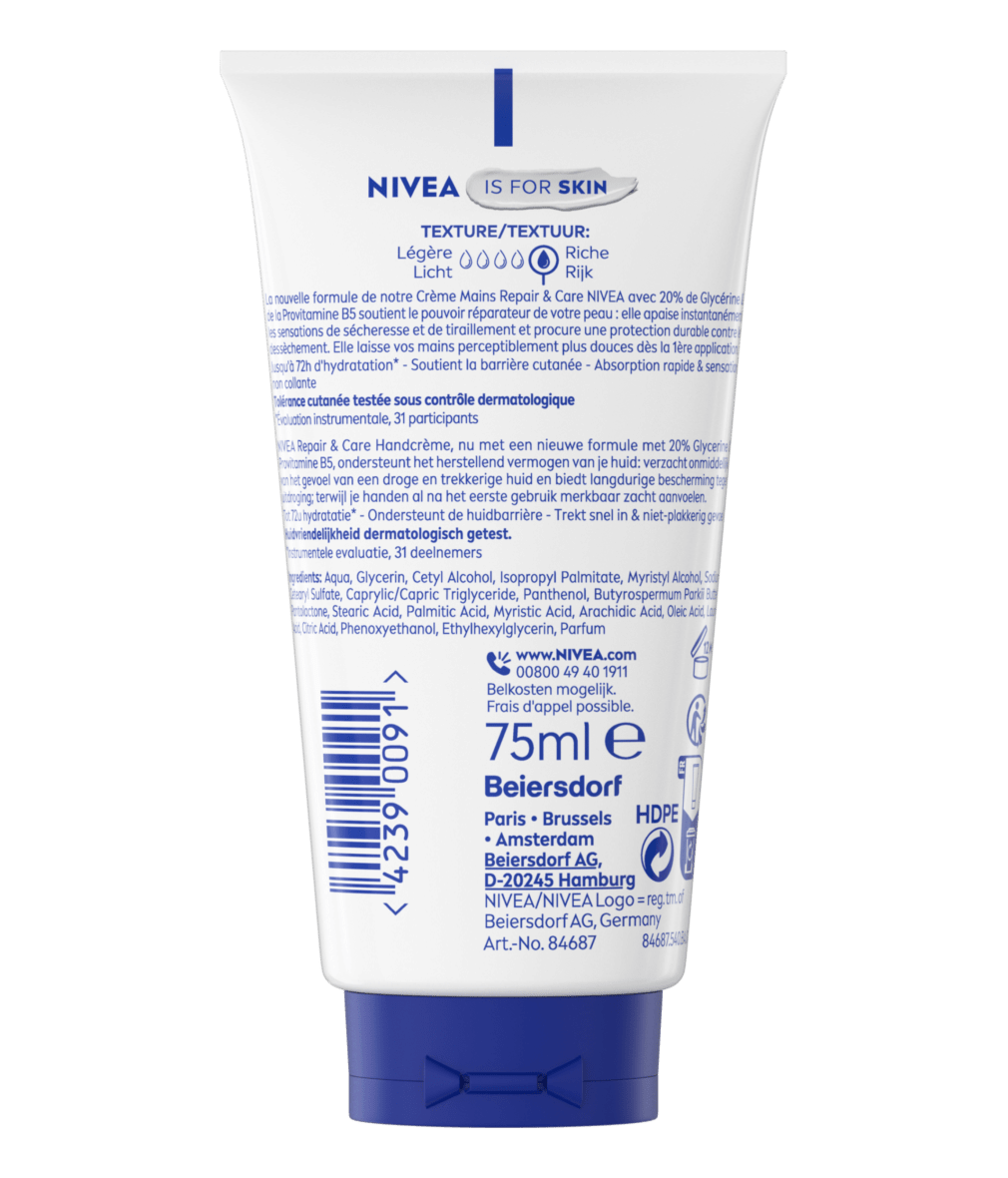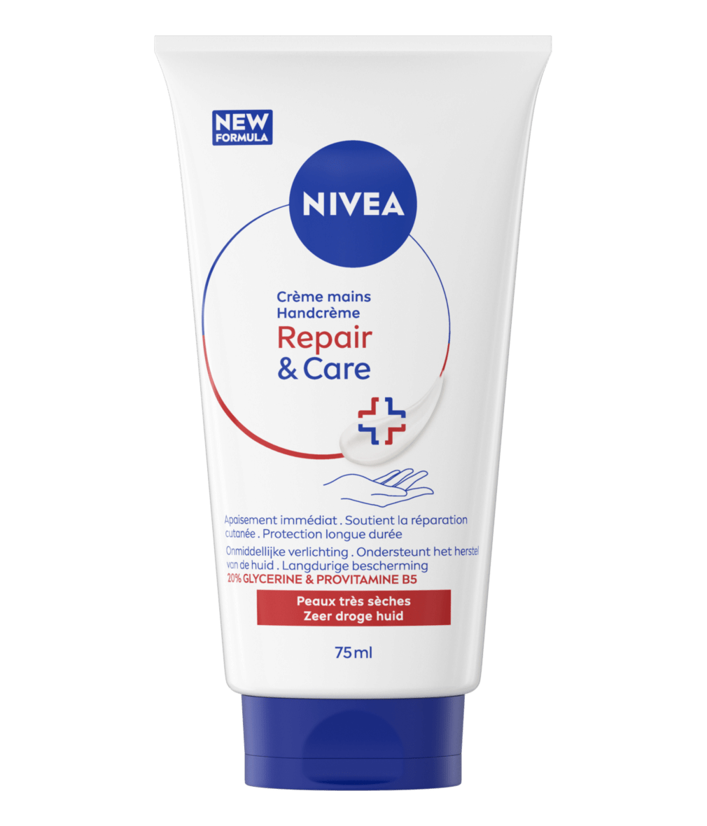 Besoin d'un soin qui nourrit et apaise la peau sèche de vos mains ? Essayez la Crème Mains Repair & Care avec 20% de Glycérine et de la Provitamine B5. Votre peau est apaisée et hydratée durablement.