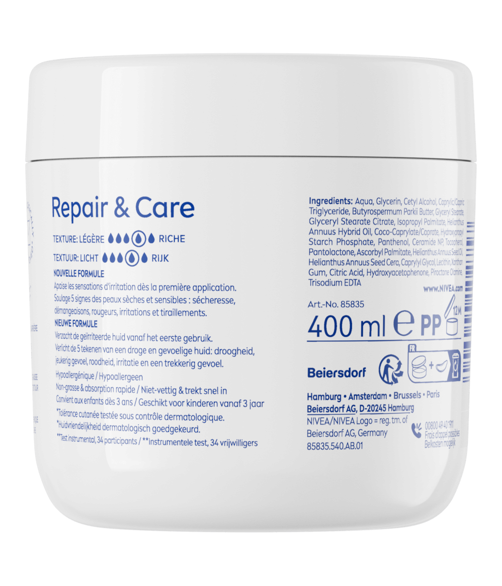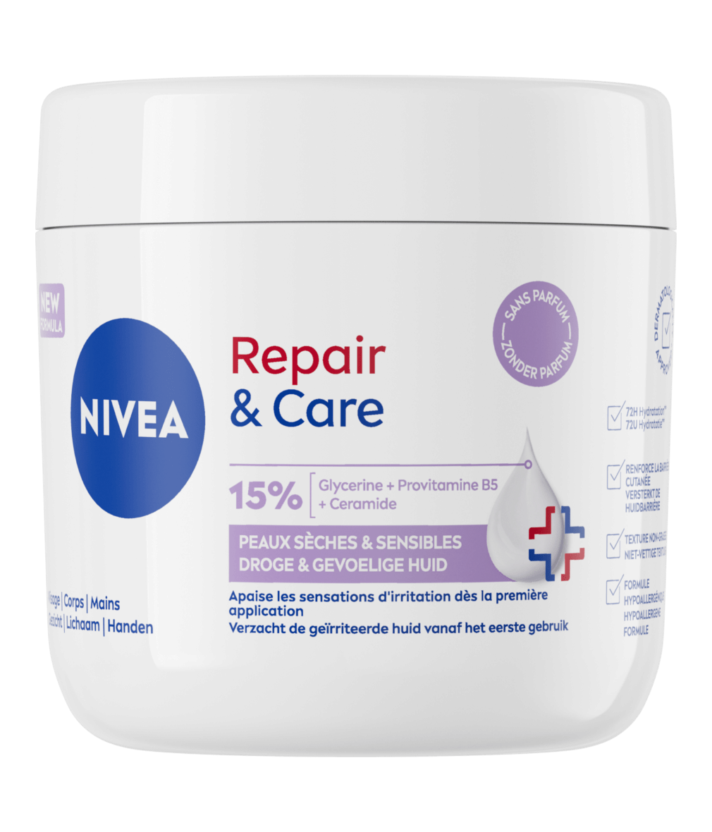 La Crème REPAIR & CARE apaise les irritations dès la première application et soulage les signes des peaux sèches & sensibles : sécheresse, démangeaisons, rougeurs et tiraillements.