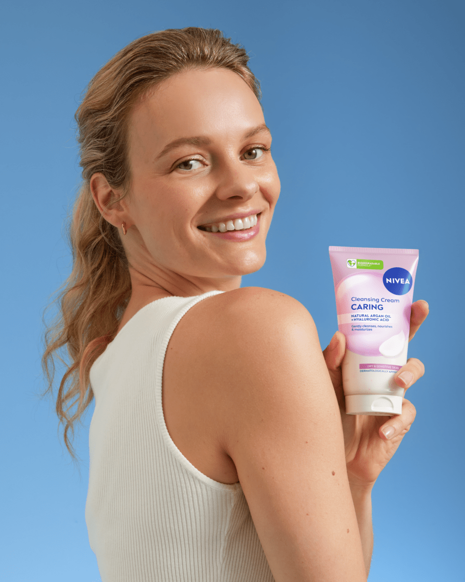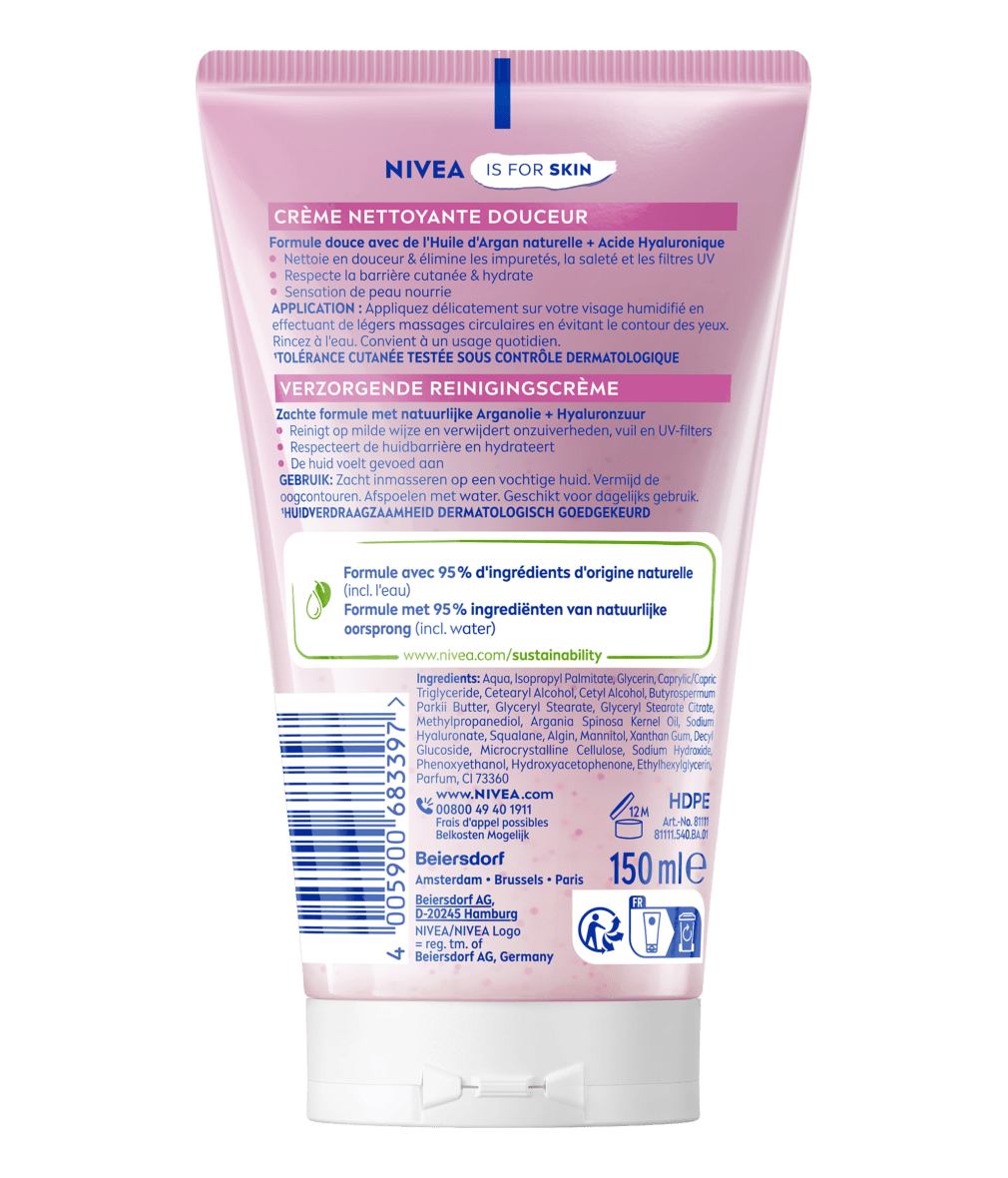 La Crème Nettoyante Douceur NIVEA avec de l'Huile d'Argan naturelle & de l'Acide Hyaluronique nettoie la peau en douceur laissant une sensation de peau nourrie.