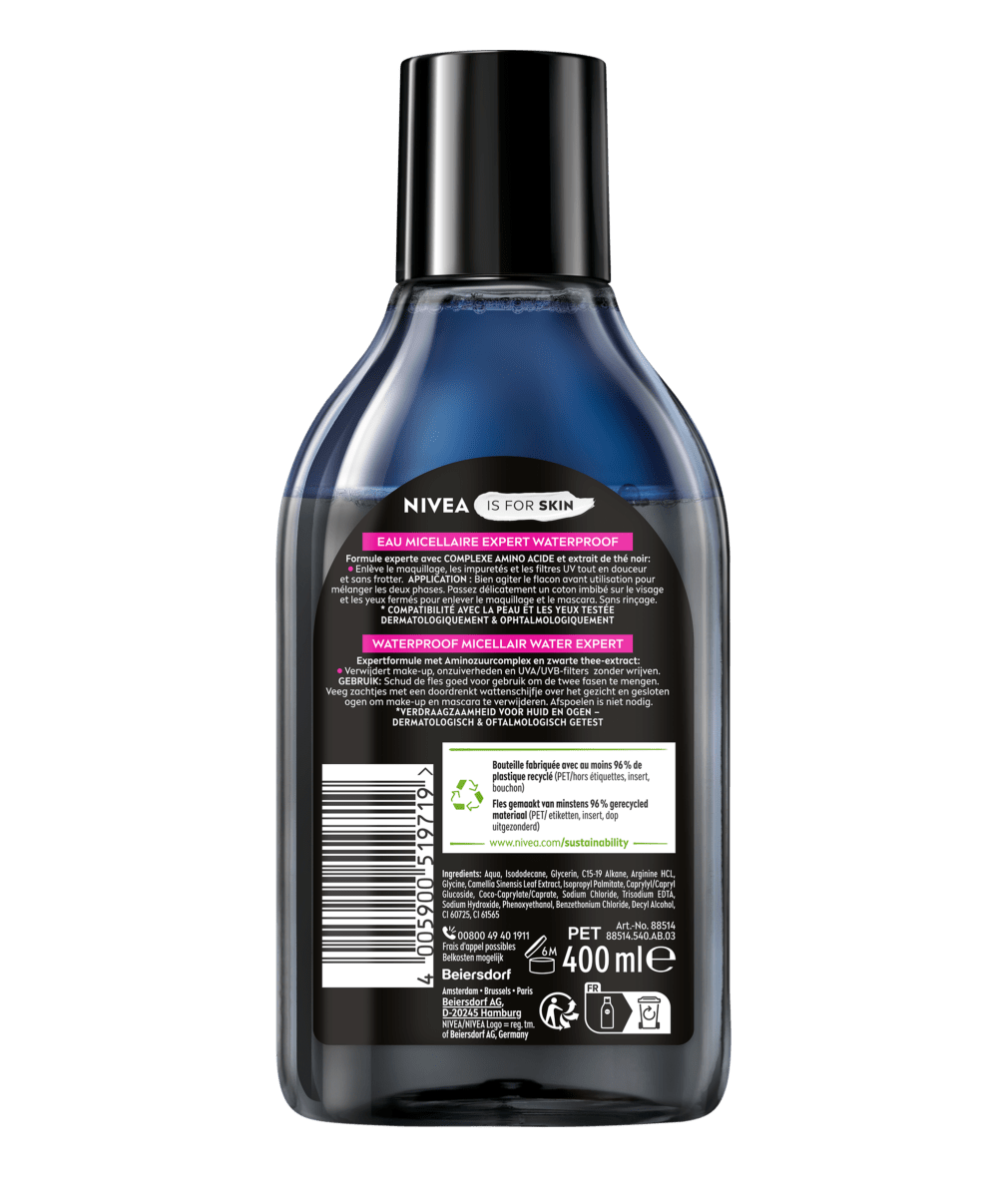 L'eau Micellaire Waterproof Expert au Complexe Amino Acide et à l’Extrait de Thé Noir élimine efficacement le maquillage waterproof sans frotter et sans rincer, tout en protégeant et prenant soin des cils. Convient même aux peaux sensibles.