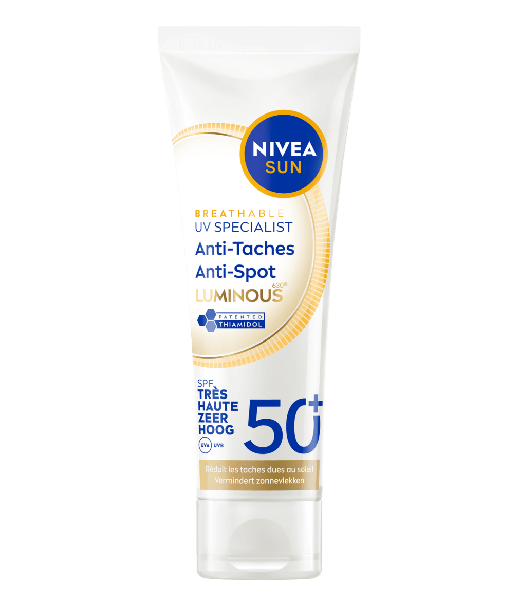 Le fluide UV Visage Anti Taches Luminous630 NIVEA SUN prévient et réduit visiblement les taches dues au soleil, grâce à sa protection UVA/UVB et son actif breveté Thiamidol.
