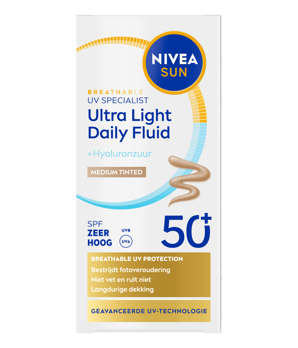 Le fluide UV Visage quotidien teinte Medium NIVEA SUN et sa très haute protection SPF 50+ offre un teint unifié et naturel avec un effet matifiant. Couvrance longue durée. Texture ultra légère,