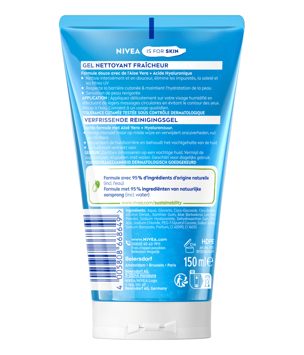 Le Gel Nettoyant Fraîcheur NIVEA est enrichi en Aloe Vera et à l'Acide Hyaluronique, connue pour aider à maintenir efficacement l'hydratation de la peau. Spécialement développé pour les peaux normales et mixtes, il nettoie la peau intensément et en douceur, éliminant les impuretés du quotidien, la saleté et les filtres solaires. Il respecte la barrière cutanée et laisse une sensation de peau revigorée. Sa formule est composée de 95% d’ingrédients d’origine naturelle (y compris l’eau). Appliquer délicatement sur une peau humidifiée en effectuant de légers massages circulaires en évitant le contour des yeux. Bien rincer à l'eau tiède, convient à un usage quotidien.