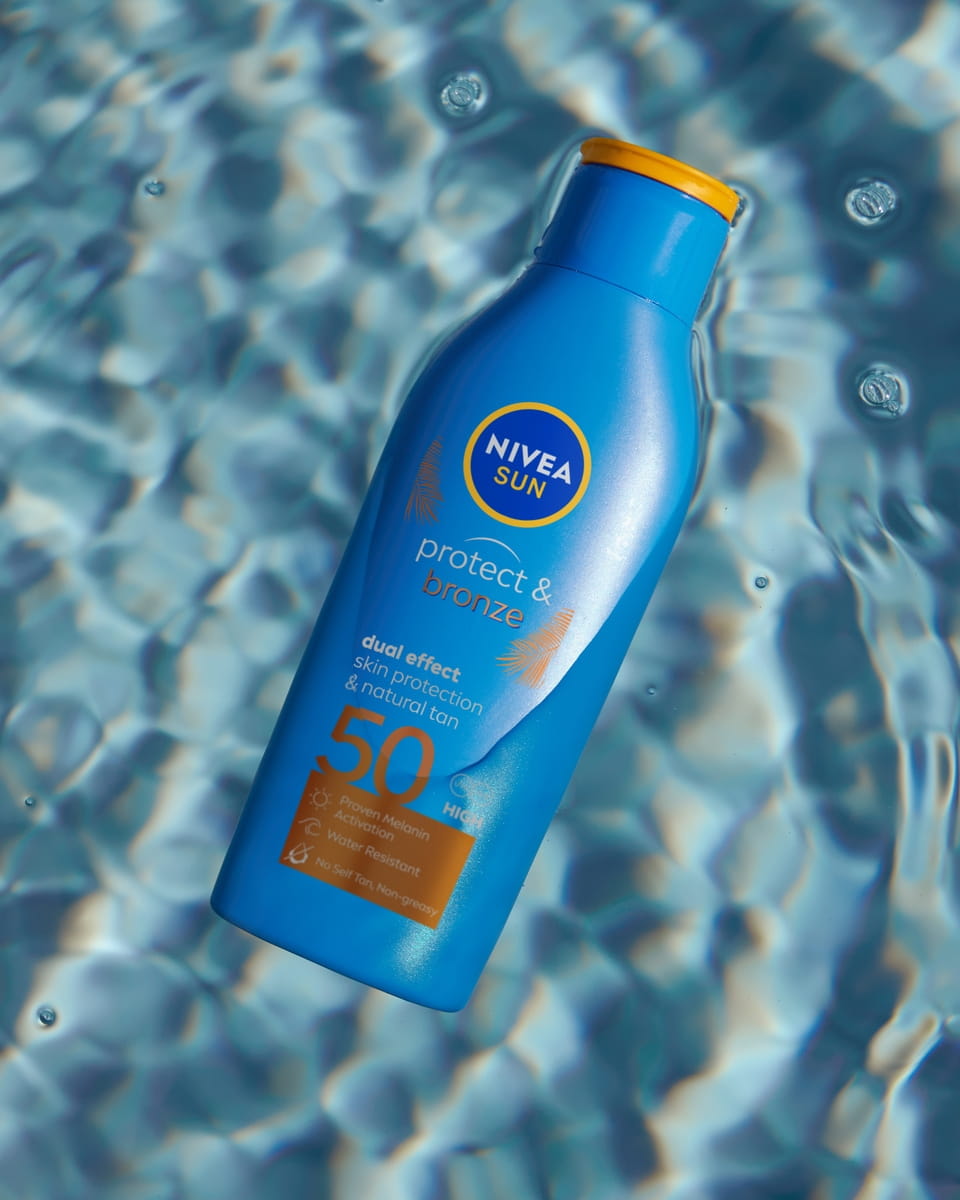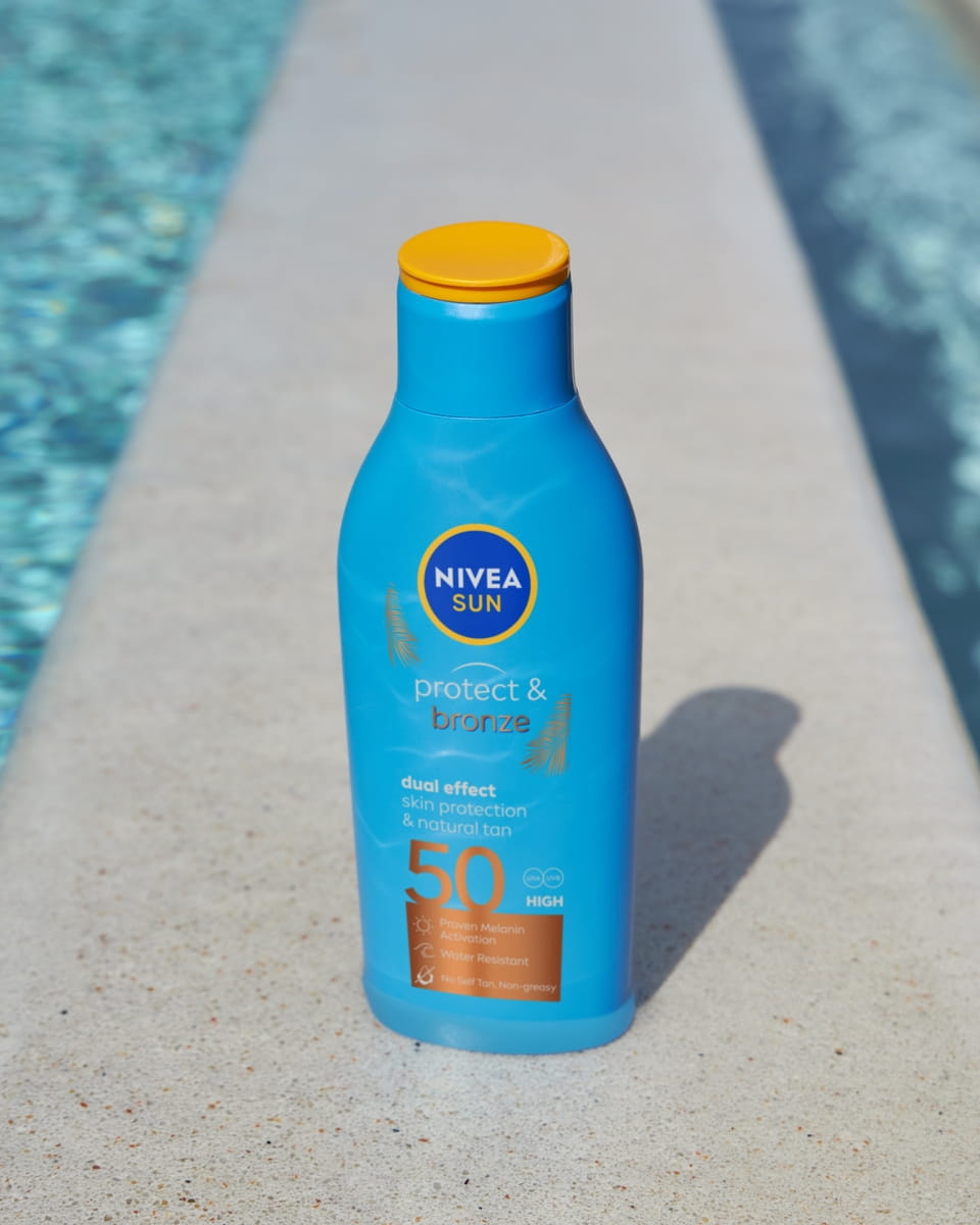 Le Lait Solaire Activateur de Bronzage FPS50 NIVEA SUN protège la peau et stimule le processus naturel de bronzage grâce à l'activation de la mélanine brevetée. Formule légère et résistante à l'eau.
