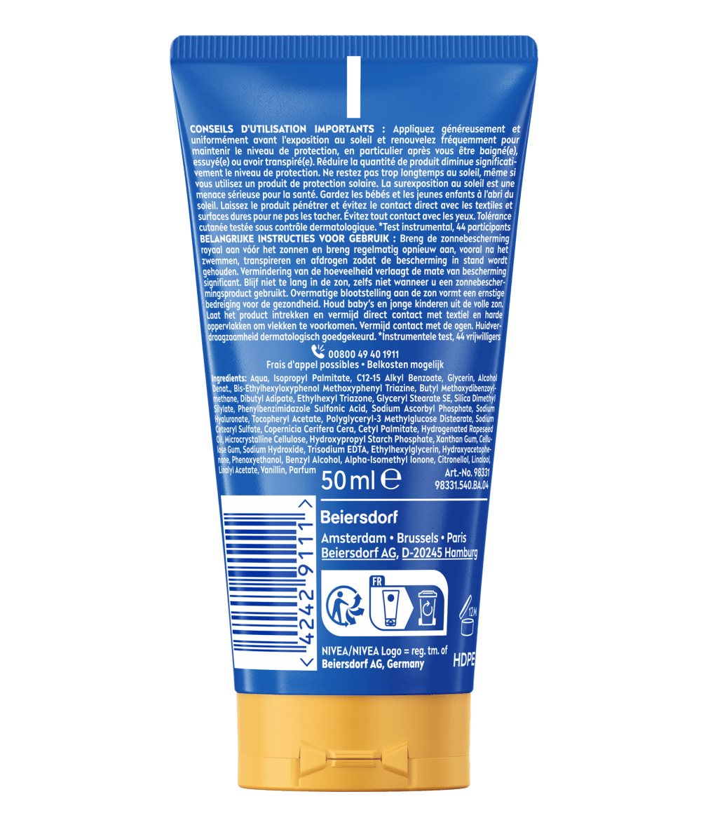 Appliquez généreusement et uniformément avant l'exposition au soleil et renouvelez fréquemment pour maintenir le niveau de protection, en particulier après vous être baigné(e), essuyé(e) ou avoir transpiré(e). Réduire la quantité de produit diminue significativement le niveau de protection. Ne restez pas trop longtemps au soleil, même si vous utilisez un produit de protection solaire. La surexposition au soleil est une menace sérieuse pour la santé. Gardez les bébés et les jeunes enfants à l'abri du soleil. Laissez le produit pénétrer et évitez le contact direct avec les textiles et surfaces dures pour ne pas les tacher. Évitez tout contact avec les yeux.