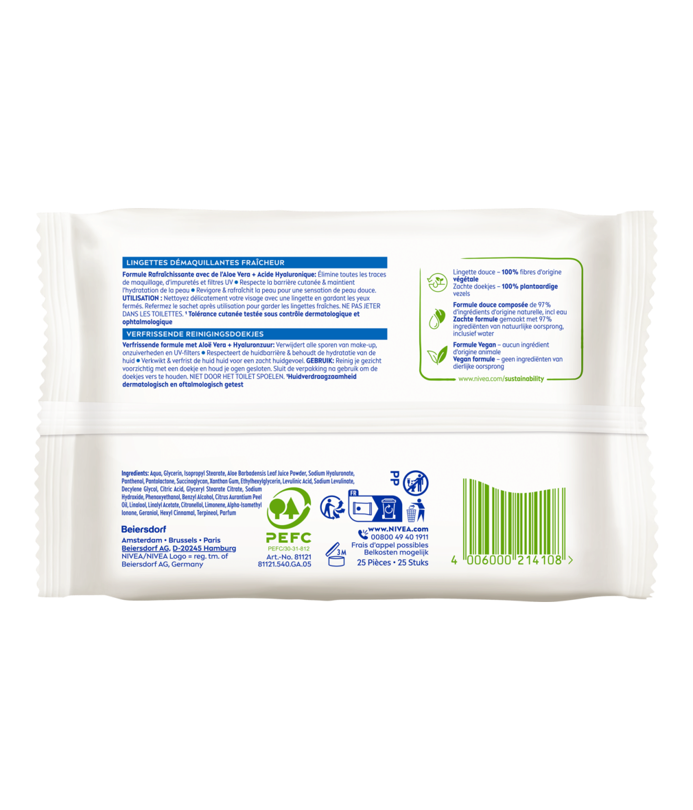 Grâce à leur formule rafraîchissante à l’Aloe Vera et à l’Acide Hyaluronique, ces lingettes composées de fibres 100% d’origine végétale nettoient en douceur.