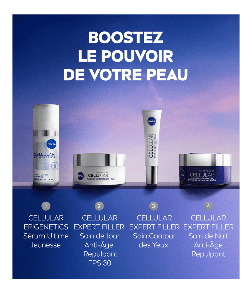 Le Sérum Epigénétique Ultime Jeunesse NIVEA est formulé avec l'Epicelline, ingrédient qui aide à réactiver les fonctions de jeunesse des cellules cutanées. Pour une peau d'apparence plus ferme et jeune.