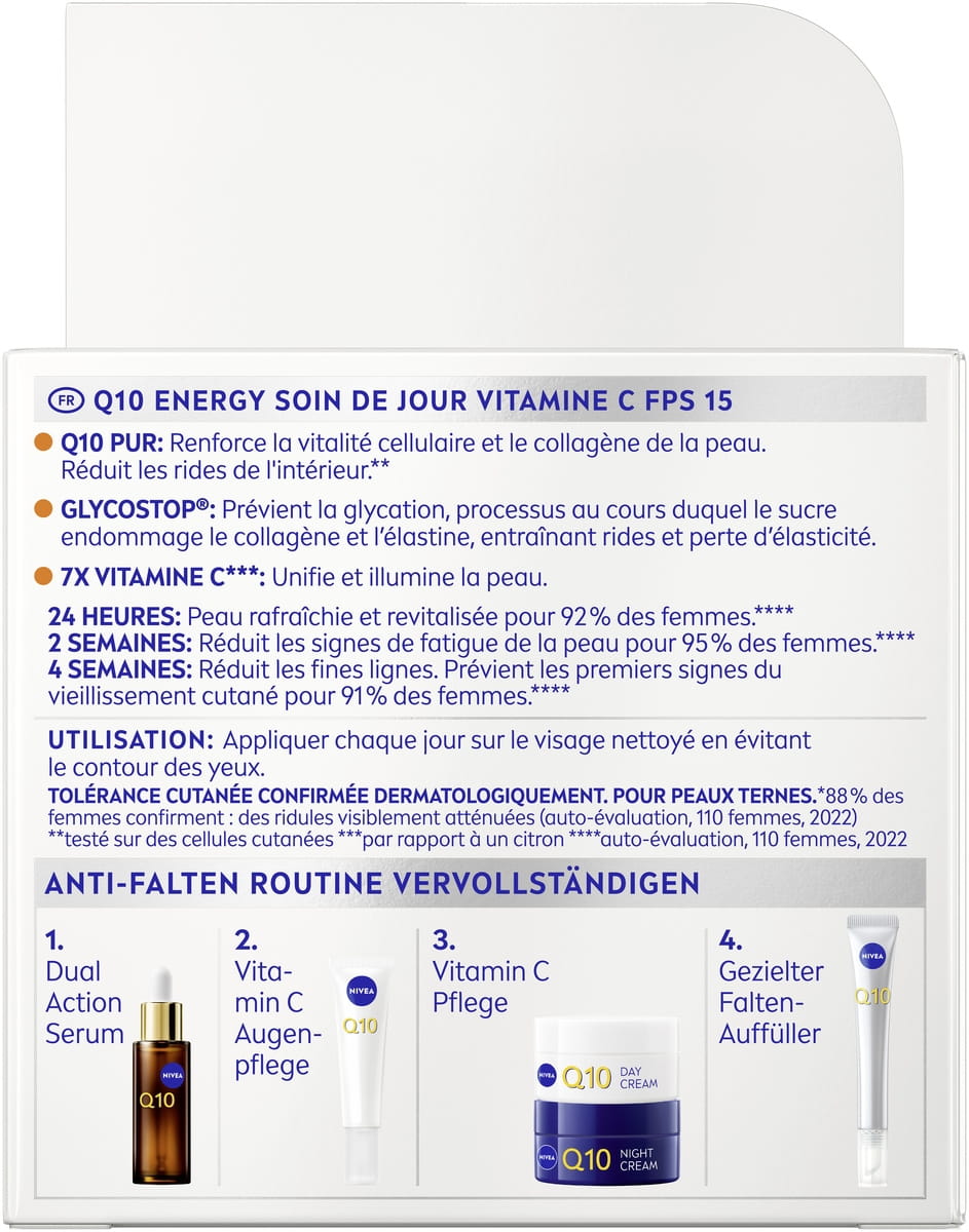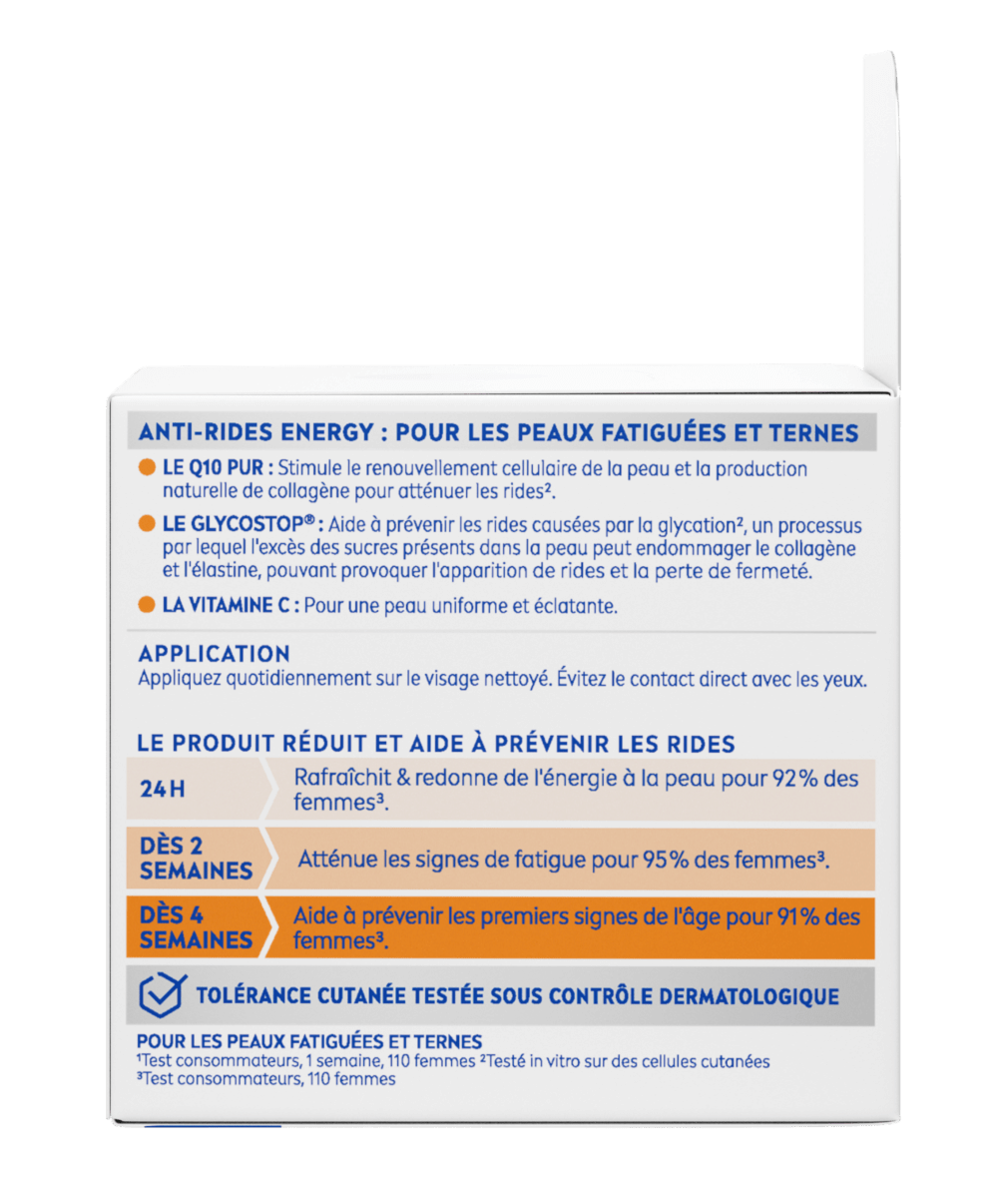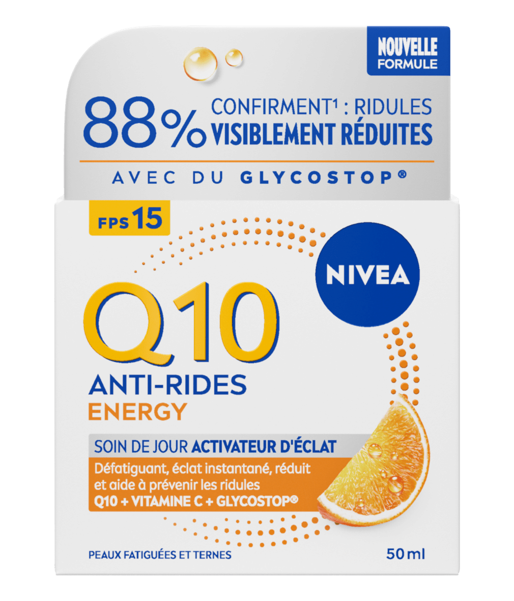 Le Soin de Jour Q10 Anti-Rides ENERGY SPF 15 avec du Q10 Pur, du GLYCOSTOP® et de la Vitamine C atténue les signes de fatigue, redonne de l'énergie à la peau et réduit les ridules.