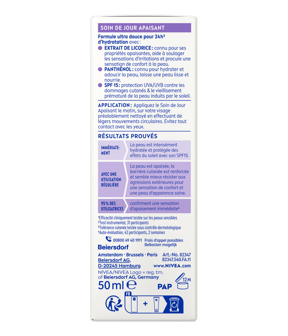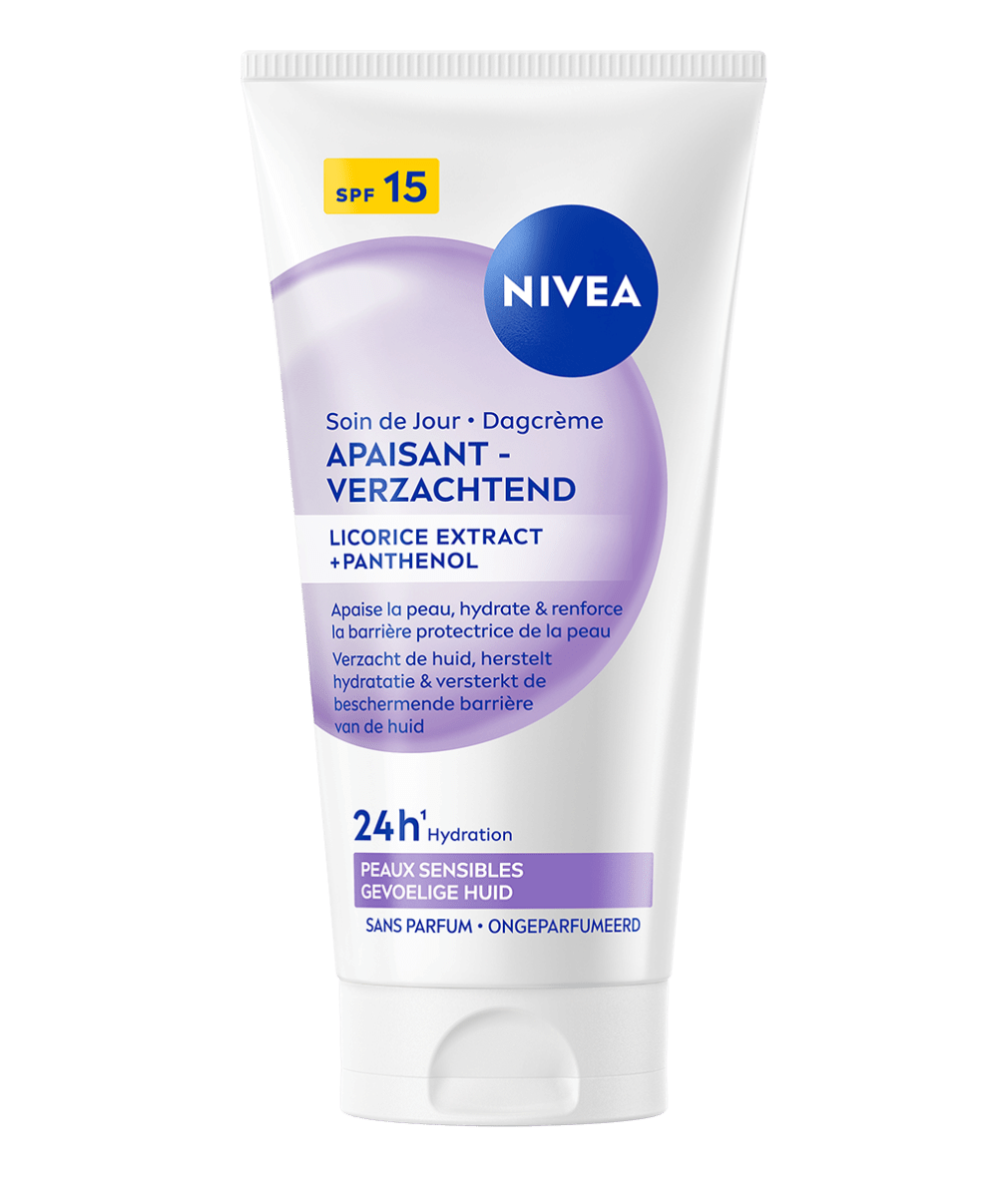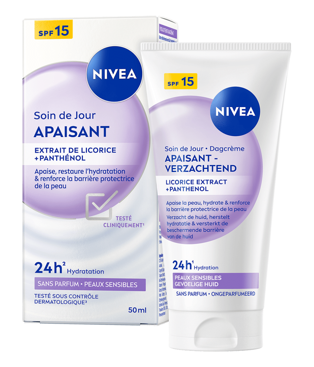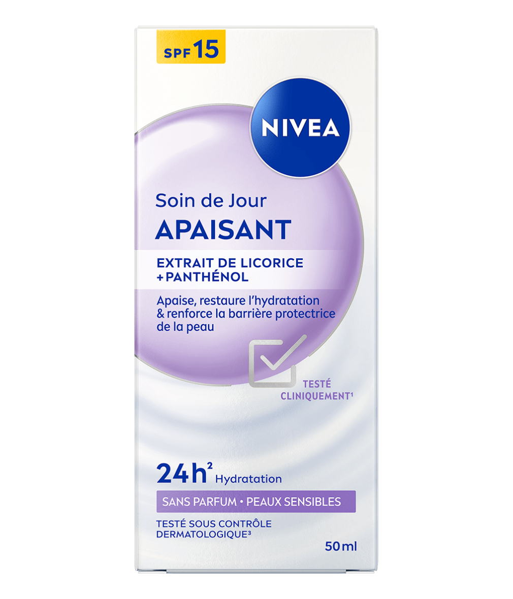 Le Soin de Jour Apaisant contient de l'extrait de licorice, du Panthénol et un SPF15. Il apaise, restaure l'hydratation & renforce la barrière protectrice de la peau.