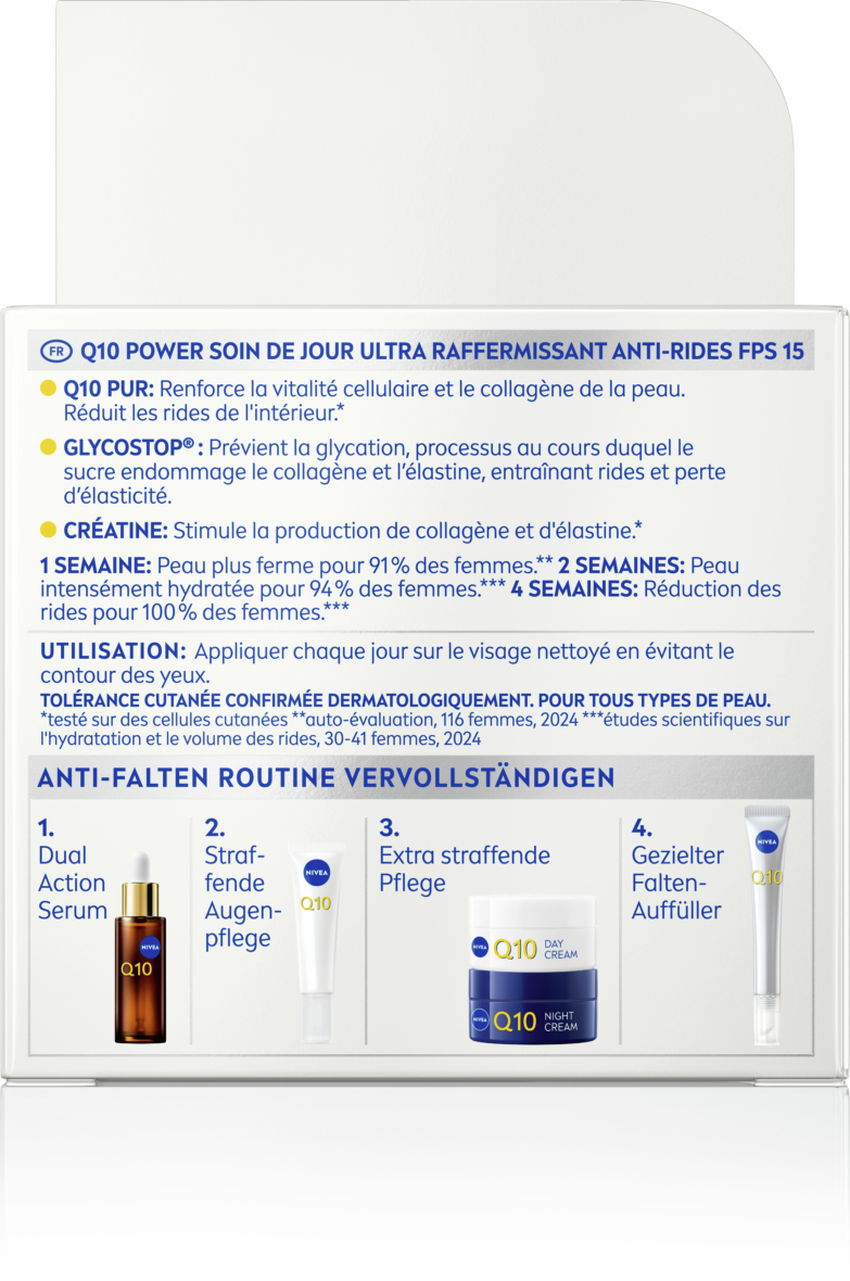 Avec NIVEA Q10 Anti-Rides POWER au Q10 et à la créatine, nous offrons un Duo Booster de Collagène* pour que votre peau reflète la puissance qui est en vous.