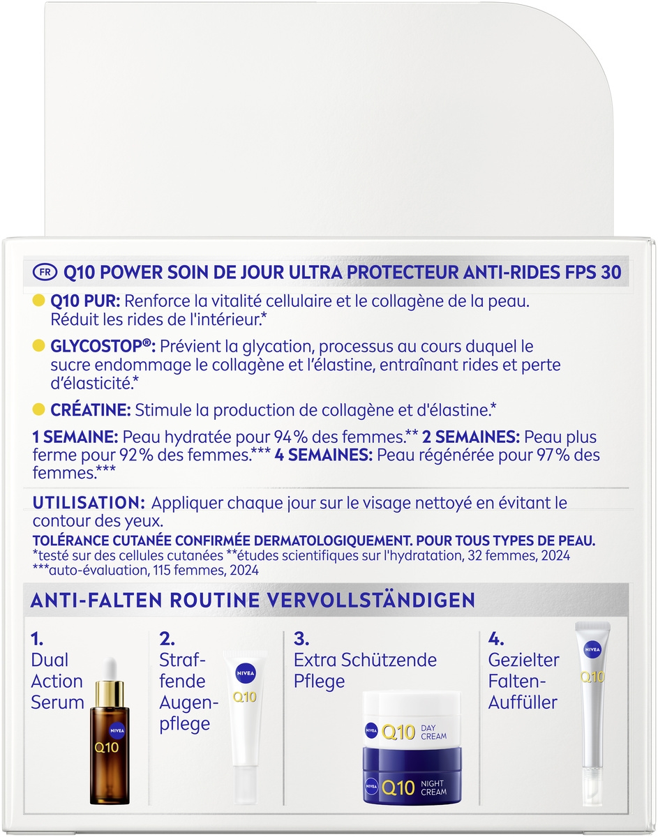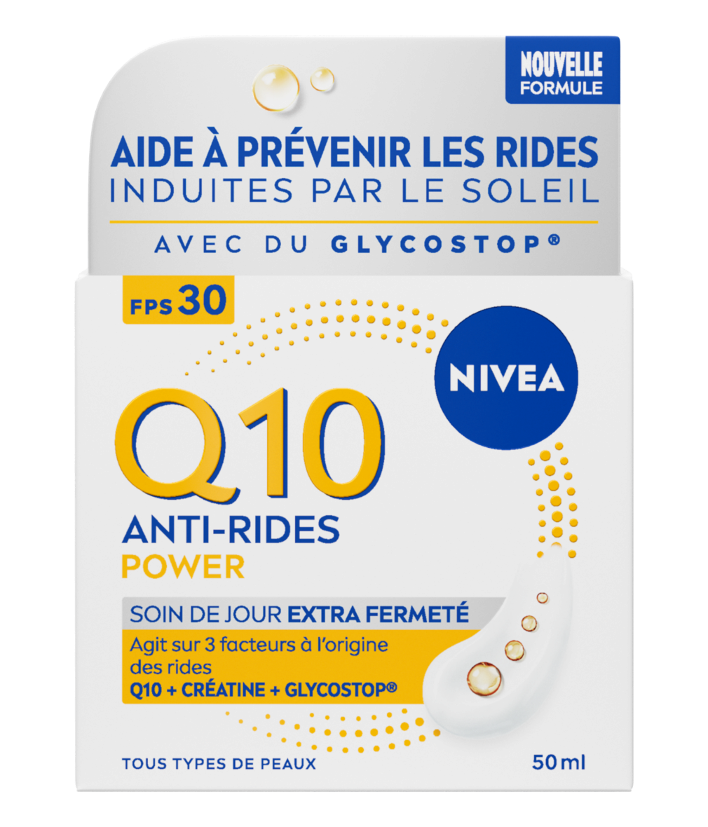 Le Soin de Jour Extra Fermeté Q10 Anti-Rides POWER SPF 30 combine le Q10 Pur, la Créatine et le GLYCOSTOP® pour aider à prévenir les rides induites par le soleil, et raffermir et régénérer la peau.
