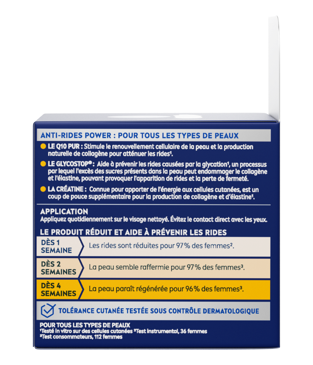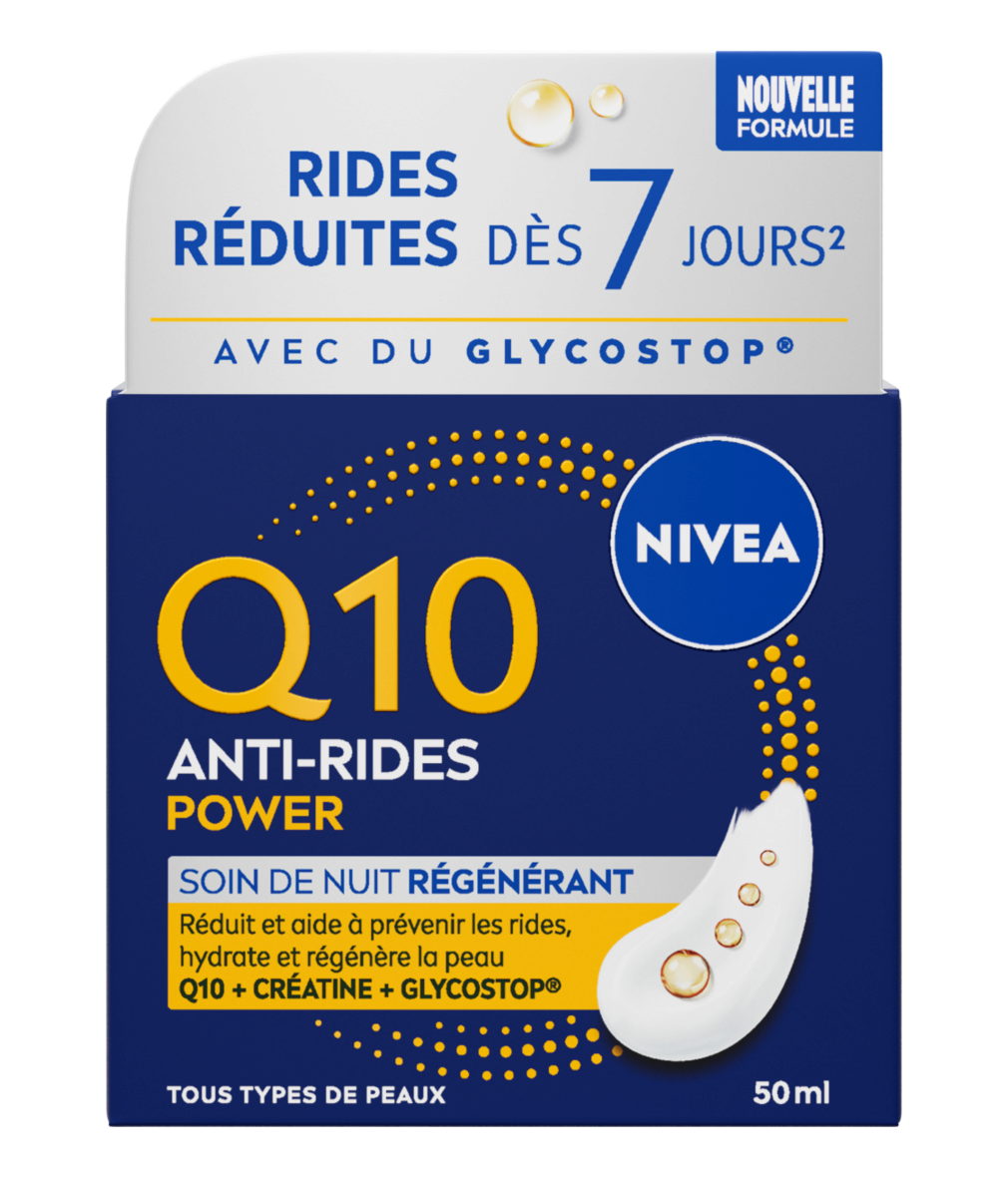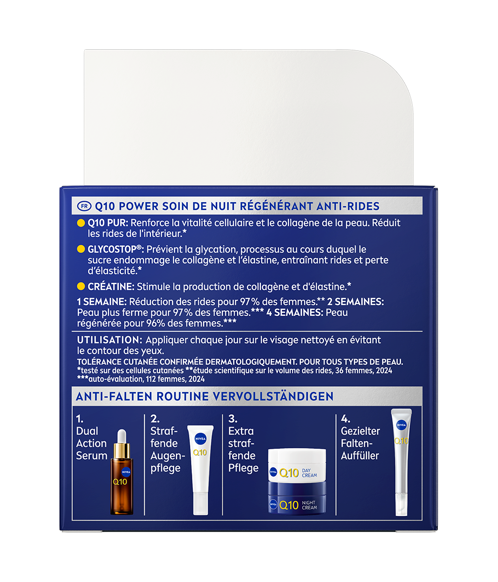Le Soin de Nuit Régénérant Q10 Anti-Rides POWER combine le Q10 Pur, la Créatine et le GLYCOSTOP® pour une peau raffermie et des rides réduites (test instrumental, 36 femmes) dès 7 jours.