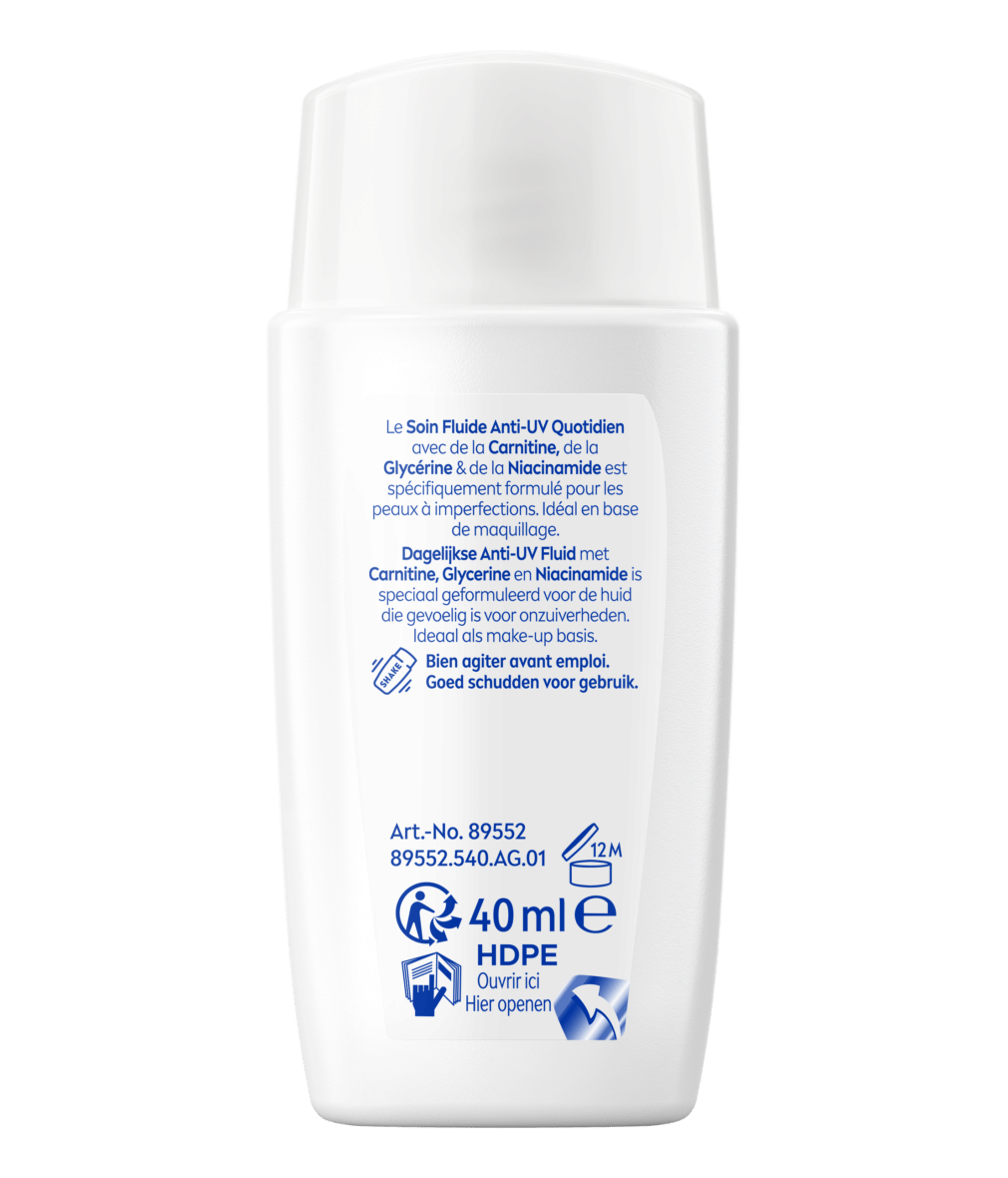 Le Soin Fluide Anti-UV Quotidien FPS 50+ est spécialement formulé pour les peaux à imperfections. Idéal en base de maquillage, il laisse la peau plus nette, fraîche et matifiée.
