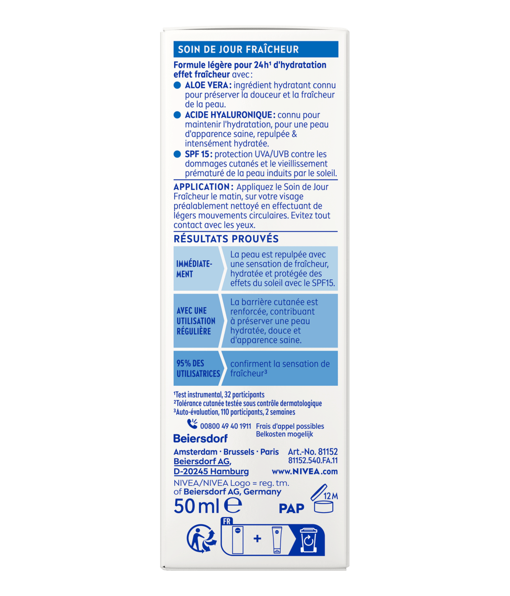 Le Soin de Jour Fraîcheur contient de l'Aloe Vera, de l'Acide Hyaluronique & un SPF15. Il revigore et hydrate intensément votre peau pendant 24h. La peau est repulpée avec une sensation de fraîcheur.