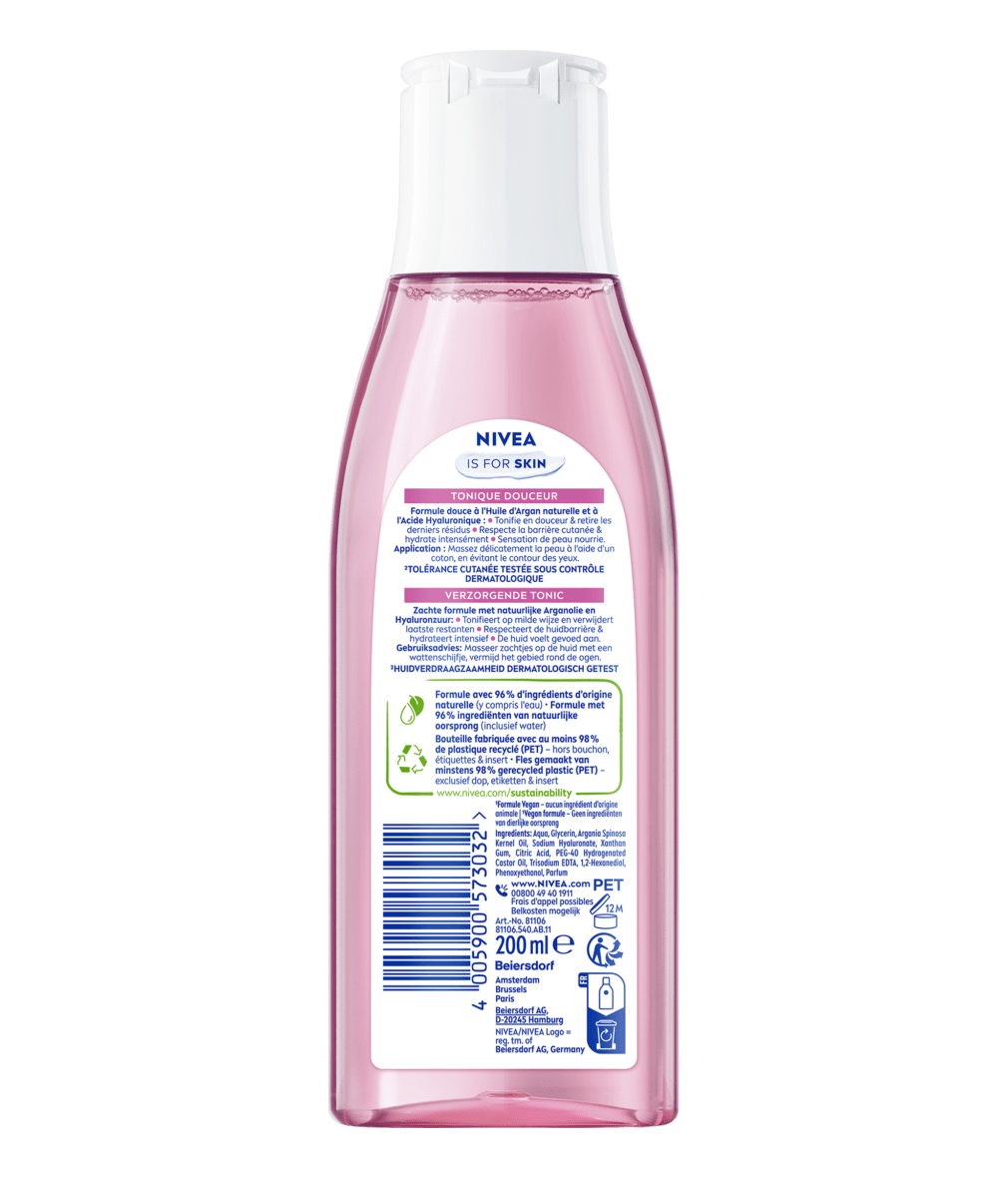 Le Tonique Douceur est enrichi en Huile d’Argan naturelle et en Acide Hyaluronique, connus pour hydrater intensément. Il tonifie la peau en douceur et respecte la barrière cutanée. Il retire également les derniers résidus et hydrate intensément, laissant la sensation d’une peau nourrie. Formulé pour les peaux sèches et sensibles et testé sous contrôle dermatologique, ce tonique est idéal pour une utilisation quotidienne. Sa formule est composée de 96% d’ingrédients d’origine naturelle (y compris l’eau). Démaquiller et nettoyer soigneusement votre visage puis imbiber un coton avec le Tonique Douceur de NIVEA et appliquez-le sur votre visage en massant délicatement et en évitant le contour des yeux.