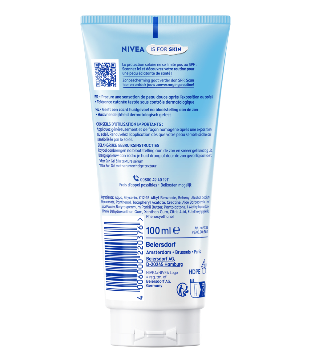 Le gel sérum à l'Aloe Vera Bio NIVEA SUN apaise immédiatement la peau après l’exposition au soleil tout en laissant une sensation durable de douceur et de confort.
