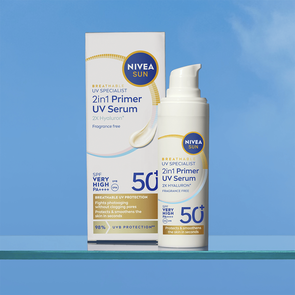 Le soin UV quotidien 2en1 Sérum Primer SPF 50+ NIVEA SUN protège contre les UVA/UVB, lisse la peau et la prépare au maquillage. Sa texture légère et sans parfum est idéale pour un usage quotidien.
